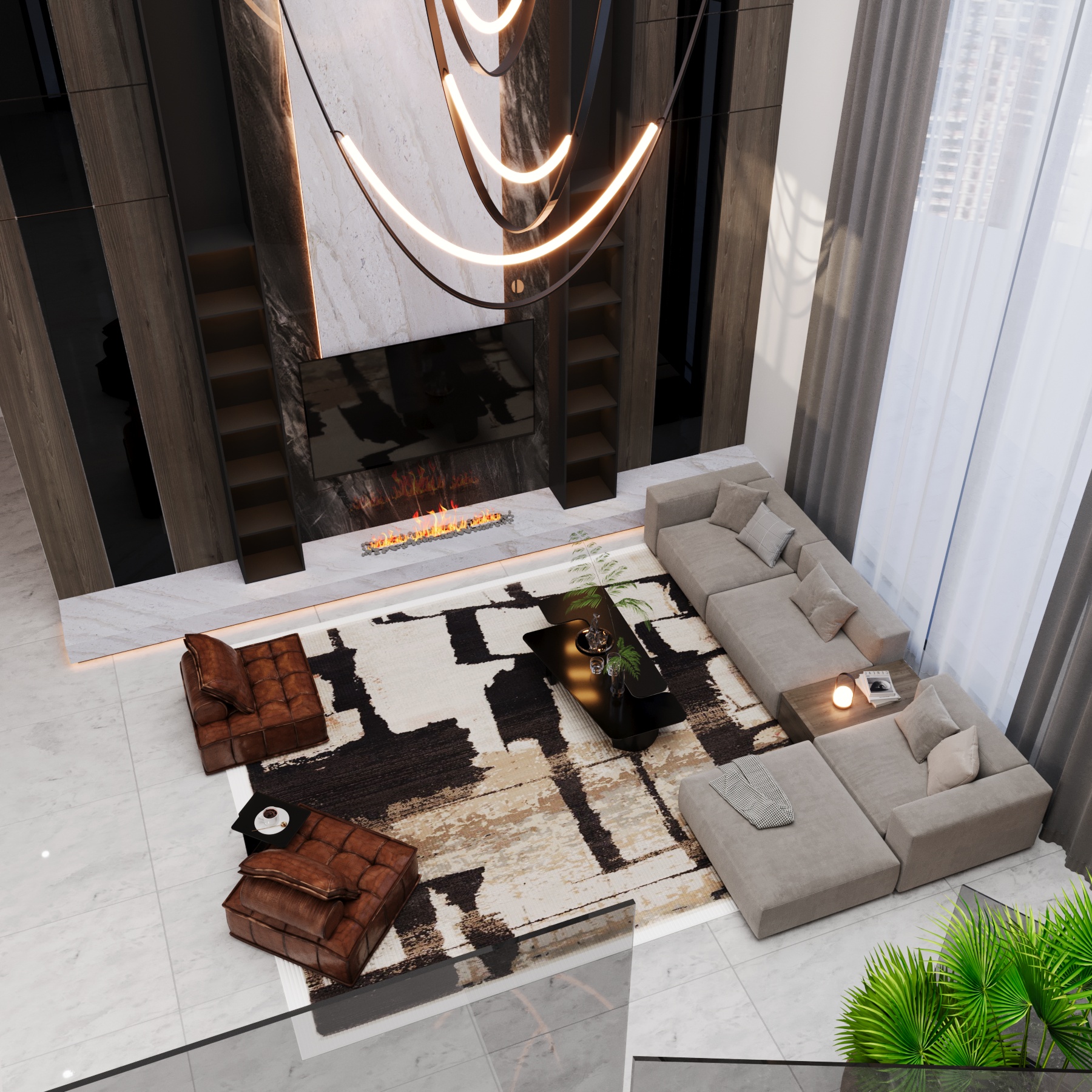 This spacious living area features a contemporary design with a cozy sectional sofa, stylish leather loungers, a sleek fireplace, and bold modern lighting. The double-height ceiling and large windows add openness and elegance to the space.