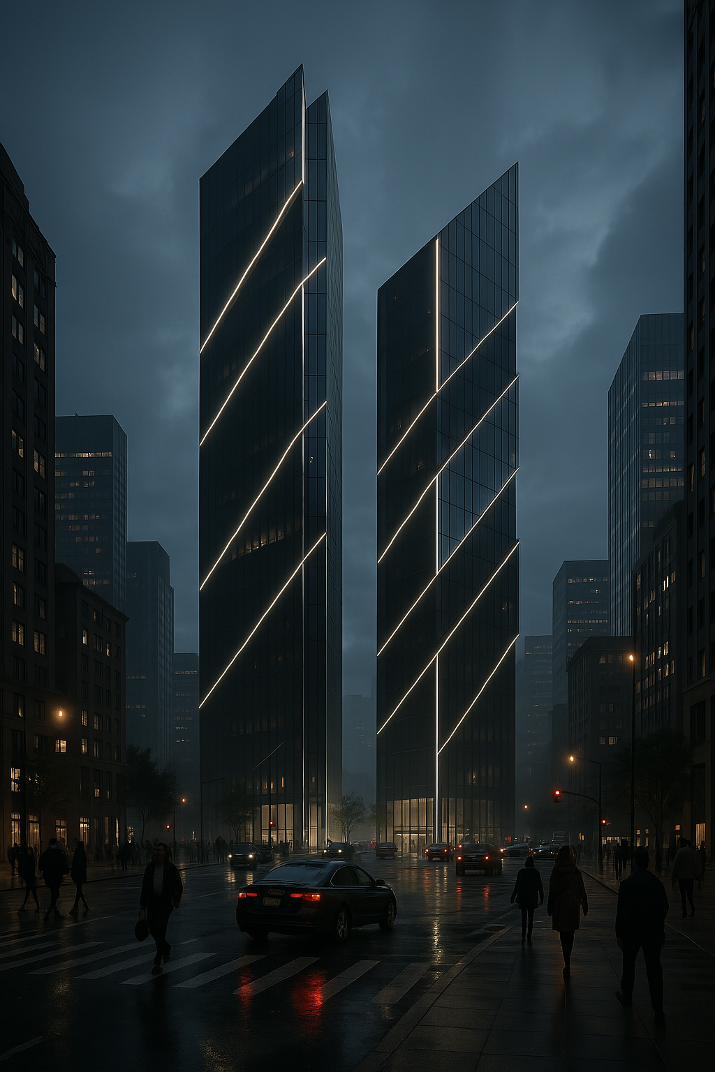 We visualized this sleek, modern twin-tower design to highlight bold geometry, dynamic lighting, and a strong urban presence. A fusion of elegance and innovation, crafted to elevate the skyline.